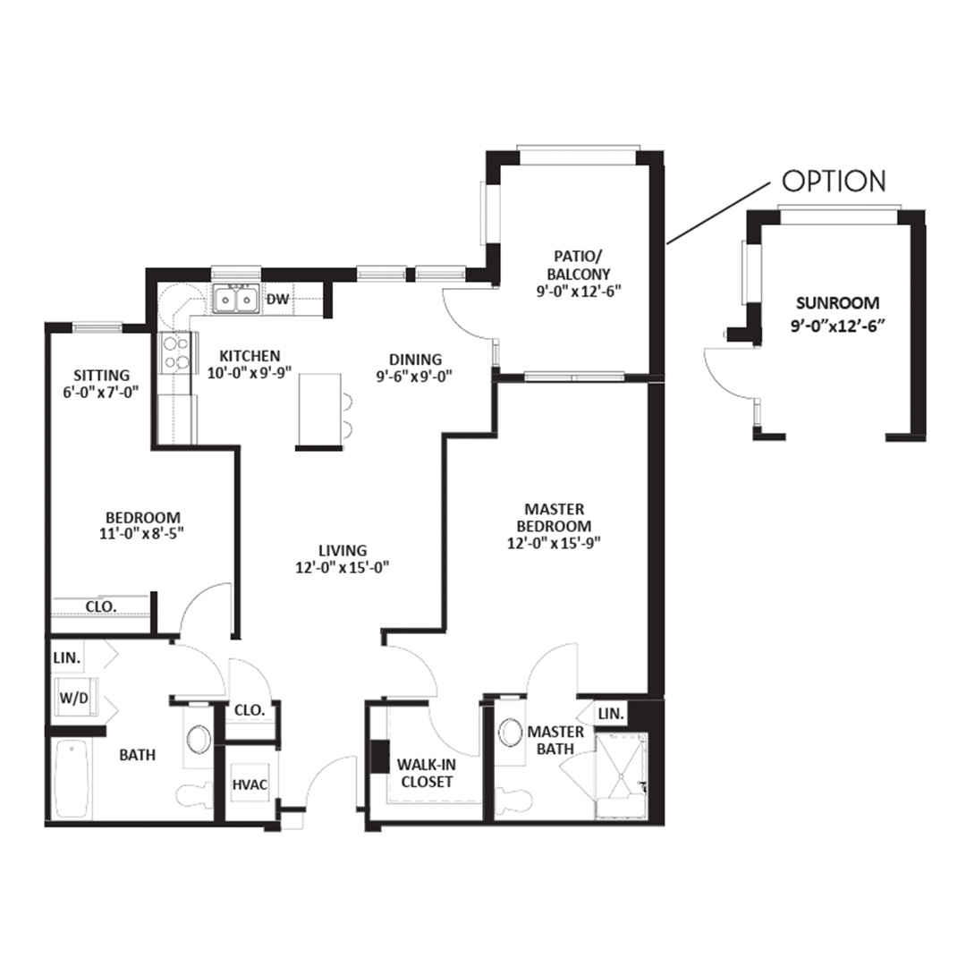An open-concept design defines Navona B, featuring a patio/balcony or sunroom off both the dining room and primary bedroom to create seamless indoor-outdoor living.