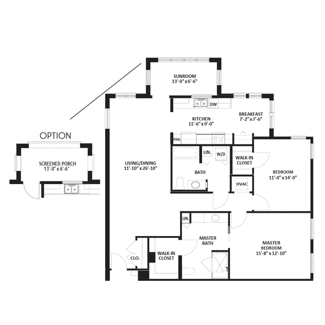 Similar to Regalo A, this layout features an entry that opens directly into the living and dining area. Host larger gatherings or enjoy meals with a view from your sunroom or screened porch.
